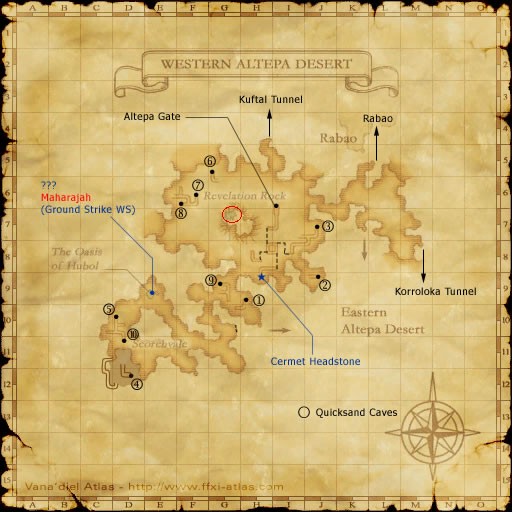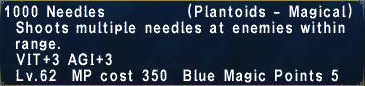 Zone into Western Altepa Desert and head to the small lake located at G-7 near Revelation Rock. It's noted above with a red circle. There are three Cactuar which live in the pool. There is aggro on the way to camp, and some beetles near the camp which will aggro via sight, and the Cactuars will aggro sound, but are non-linking. Take proper care. This is the best camp because there are always Sabotender here, and you do not need to wander the zone to find them. Many would think that Eastern Altepa Desert would be a better camp, as the Sabotender there are much lower in level, and not too hard to find. It would be, if not for one thing: Cactrot Rapido. He's a level 80 or so NM Sabotender that runs about the East Desert just looking for someone fighting a regular Sabotender. He'll link with what you are fighting, and then, while providing a righteous beat down, he might gift you with a viewing of 10,000 Needles. Needless to say, this can put a real damper on your spell hunting. Don't hunt in the East. At the level which you can learn the spell, the Cactuar will present no challenge. But surviving the required view of 1000 Needles is needful! This is easily done by bringing at least two other people (or pets, avatars, wyvern, puppets, or Adventure Fellows) This will divide the damage between all of you, and you'll have no issues surviving the spell. Kill the Cactuars in the lake one at a time until you get the spell. They repop fast enough that you'll not need to stray for more targets. ~~~ If you find yourself needing to hunt the spell, and no friends are about to help, and you don't have a fellow who can survive a 500 point hit more then once, then you can still hunt the spell. You just need to be much more careful. Here is a method used by a BLU/SMN, though it would work for /BST or /PUP with minor changes to fit the subjob choice: First have carby buff you with Shining Ruby, and eat a meatkabob for ATT, and gear up for DEF, drank a Persikos Au Lait. Engage the target with Carby. Since Carby doesn't do much damage at all, he won't pull hate, so you will be tanking. Start off with heavy DD spells, and lower the mobs health to under 40%, then rely on staff or club damage only. That way, after the mob uses 1000 Needles, you can spam DD spells quickly to kill it without worrying about it getting enough TP to fire off another Needles before it dies. When 1000 Needles goes off, carby will probably die, You'll take 500 damage, but should still be in very good shape afterward, and finishing the mob off is easy. Since carby is draining your MP quickly, you want to finish each fight as fast as possible. If you are closer to the level to learn 1000 Needles, your staff skill (if leveled) will allow you to hit the mob reliably, so you might consider using a Light Staff to help with carby's perpetuation cost. Remember that your physical spells will not land as well if you use a club or staff. So switch to your sword when you move to casting DD spells.