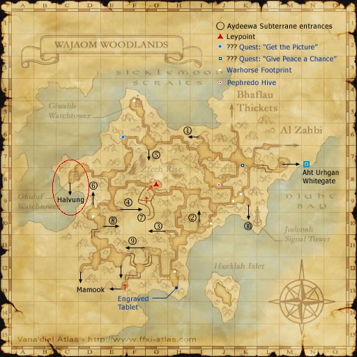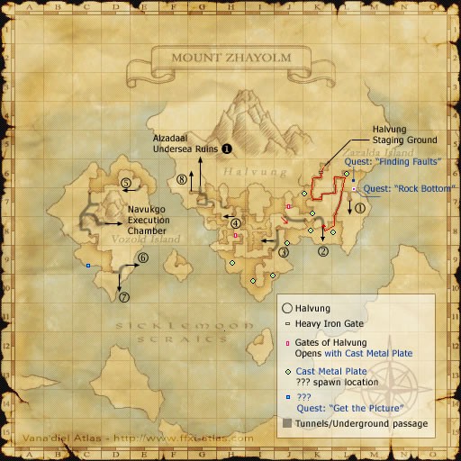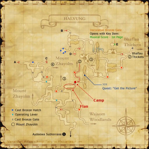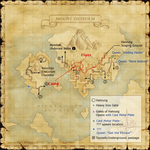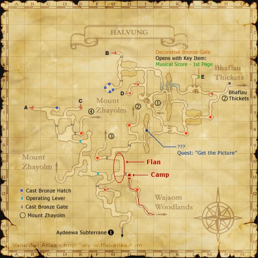 To get to camp #2, zone into Mount Zhayolm from the staging point , head to the Gates of Halvung at J-7. You'll need invisible to get past the clusters, and if it's night, sneak to pass the Ghosts. To open the gate you need to have the key item one gets from checking the Metal Plate ??? spawns. To get the quest, click the gates then find the active ??? that will give you the key item. Now head to H-7 where the camp is. To reach it you need to pass sight aggro Trolls, and sight, and Job Ability aggro Flans, your targets. There is also one sound aggro Clot in the tunnel that your camp will be in. It's far enough back to not be an issue, but take care to not aggro it. There can be True Hearing Wamoura along the way. Give them some distance when passing them. Once you are in