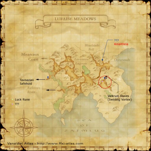 Zone into Lufaise Meadows by using the Valkrum Dunes Swirling Vortex, and you will be at your camp. There are several Bugards close by in the K-9 area that you can pull back to your safe camp to fight. The area is circled in red above. There are also sight aggro Giants in the area, so take care. Having a ranged weapon to pull with can help a great deal. The fights are pretty simple. Buff up, pull, enfeeble the Bugard with Wild Oats, Sandspin, and Sprout Smack, and then feed it TP with your sword. Watch your health as some of the damage moves can hurt. If you get into trouble sleep your foe, and zone back to the dunes. Awful Eye can reduce your Strength by a massive amount, but it's a Gaze Attack, so you can fight with your back to the Bugards if you wish to avoid it. You should have no problems safely learning here once the Bugards are DC or less. Even though the Bugards in Misareaux Coast are the same level, Camp #1 is better then the ones you can find in the Coast, thanks to the ease of reaching targets, the nice number of Bugards to pull from, and the easy zoneline back through the vortex.