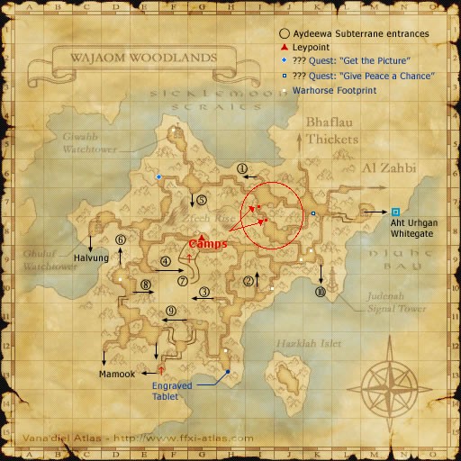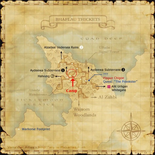 Zone into Bhaflau Thickets and proceed to G-8 on the map. The exit from the path leading into this open area at G-8 is a safe camp. There will be sight and sound aggro on the way to it, so take precautions. Taking a Chocobo to camp is a perfect solution. Your prey can be found in the Red circle on the map above. There are six Marid spawns here. See Camp #2 for the fight stratagy, all the rules hold here.