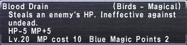 | The Spell's Drain is equal to your (Blue Magic skill x 0.33). | |||||||||||||||||||||||||||||||||||||||||||||||||||||||||||||||||||||||||||