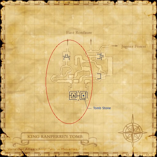 When hunting this spell there are so many low level Giant Bats to choose from, that picking a best camp is difficult. King Ranperre's Tomb works well, because in the area marked above, there are a ton of Giant Bat Spawns that can all be easily reached and soloed, and they are up all the time, not only at night, like the open area Giant Bats. The Giant Bats do aggro and link, so take care. Grab a Giant Bat and pull it to a safe camp, then bop it with a low damage weapon for TP until it gives up the spell. Simple!