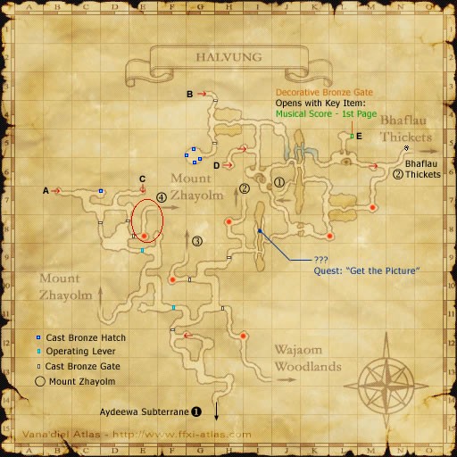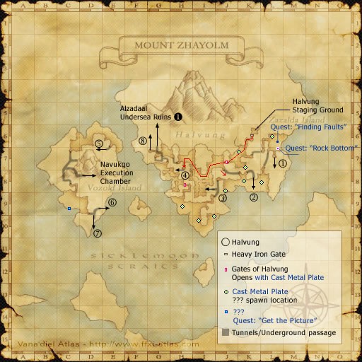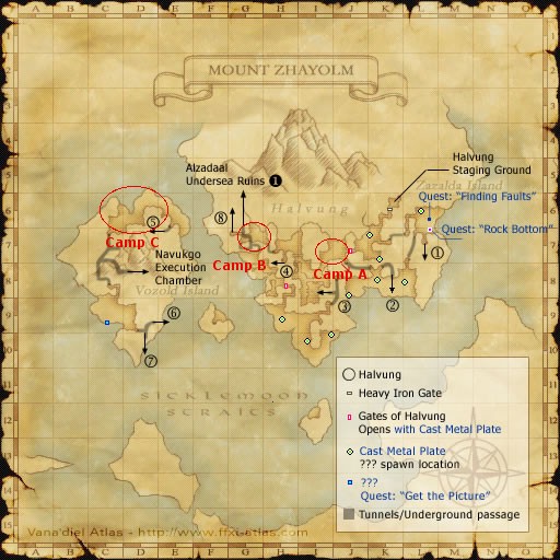 To reach this camp, you will follow the same path as you did to get to camp #2. Once you zone into Mount Zhayolm via the the staging point, you'll need invisible to get past the clusters, and if it's night, sneak to pass the Ghosts. To open the gate you need to have the key item one gets from checking the Metal Plate ??? spawns. To get the quest, click the gates then find the active ??? that will give you the key item. It's also possible to reach the camp without the cast iron plates through the Alzadaal Undersea Ruins. You will then need to pass sight aggro Trolls, and sound, magic and Job Ability aggro Flans. At H-7 you will head to the zone in the little tunnel to the south. Zone into Havlung at the point marked with a '4' on the map above.