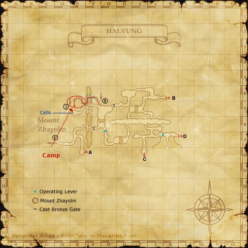 While camp C is not recommended, there is a very good camp on the way to it. Enter Halvung at the entrance marked 8 on the first map, and move toward the exit at the one marked 5 on the map above. There are some bombs along the way, so use invisible to get past them. Once you are in the tunnel leading up to the exit to Mount Zhayolm (marked with an 5) you will find two Wamouracampa. They are lower level then the ones found earlier on the Mountain, and thus a bit simpler to kill. Handle them as directed in the Camp #1 notes. There is a red circle marking the location of the two spawns. You can camp near the Mountain zoneline safely. ~~~ A Level 70 BLU/NIN can Solo the spell at this Camp! You will need juices, auto-refresh, and sanction refresh. Having Eithers is very useful. Be sure to have Pinecone Bomb, Blastbomb, Magnetite Cloud or Mysterious Light set. Back up sleep spells will not hurt. Have a way to Dispell set. The strategy is to kite the Wamouracampa that you find in the tunnel up and down using Blastbombs Bind and Pinecone Bomb's Sleep to gain a bit of time when needed, while dealing steady damage to it with DD spells. The Gravity spells can be a real help. You can melee it, just keep Metallic Body up, so you can cast without getting interrupted if your shadows are down. Always try to keep shadows up. Eating a Cannonball is no fun! If things start to go bad, or you run low on MP sleep the Wamouracampa and zone.