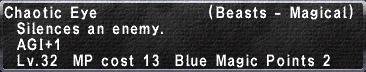 | Chaotic Eye can be paired with any of the following spells to create the Conserve MP Trait: Zephyr Mantle, Frost Breath, or Firespit. | ||||||||||||||||||||||||||||||||||||||||||