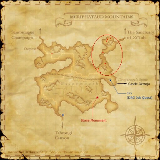 Proceed to the J-4/K-4 to J-7/K-7 area of the Meriphataud Mountains circled in red above. In this area there are several Coeurl spawns. The red dots above note the general pop area of several of the spawns. If you are hunting around level 25 you'll face aggro from Goblins and Yagudo in the zone on the way to camp. They, like the Coeurl aggro by sight. Take precautions. A Chocobo is a great way to get to camp. Once in the area, find a safe camp, and pull the Coeurl to it. The fights should not be hard, and regular solo methods work fine. If you don't wish to be silenced by Chaotic Eye, fight with your back to the monster, and cast low damage/low mp spells to feed it TP. As Chaotic Eye is a gaze attack, it will not work if you are not looking at the Coeurl.