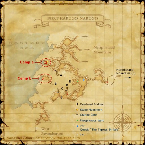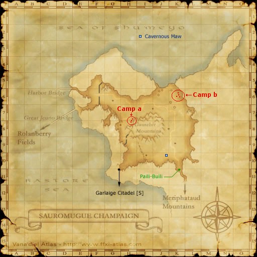 Seven Gnats can be found in Sauromugue Champaign [S] as marked on the map above. There are three spawns in Camp a, and four at Camp b. Camp a is the better of the two camps, due to less aggro from Goblins, which roam near the b Camp in fair numbers. Fight as detailed in Camp #1.