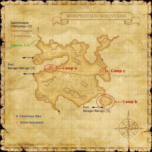 Gnats, can be found in Meriphataud Mountains [S] as marked on the map above. They are of higher level then the the Gnats found in Camps #1 and #2 above, so they are, of course, harder to kill. The three camps in this zone are good due to ease of access, and number of spawns. So even though these Gnats are higher level, they might be a good choice if you have a solid party. Use the hunting methods described in Camp #1, remembering that these Gnats are a bit harder. Of the three camps in this zone, Camp a offers the easiest access, a good number of spawns, and not too much aggro in the area, though there are a few Goblins about that you'll need to watch for. Camp B is wonderful once you reach it, as it only has a few Goblins wandering about with the Gnats, and a nice safe camp to pull to, located in the path leading back to the Fort zoneline. Camp C is not recommended, as there is a large amount of Yaguto aggro near.