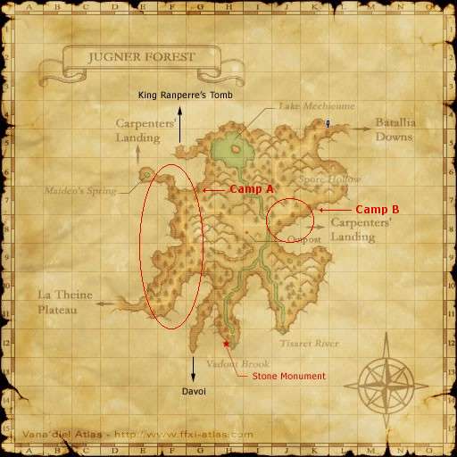 The Best place to hunt Tigers is in Jugner Forest. The first Camp, named Camp A above, will be along the West side of the zone, ranging along the road. If you are hunting in your 20's you will get aggro from Orcs, Goblins, Tigers, and the rare Walking Tree if you are unlucky. The Camp Zone circled in Red above is fairly low on aggro mobs, so if you are careful in it, you should be fine. There are four or five spawn points. The Tigers are dangerous, so do not hold back in your fights. Be ready to cure yourself, and remove Paralysis as needed. Open your fights with an Enfeeble like Wild Oats, and then use the Head Butt/Bludgeon method to win your fights. If you desire the spell at the time you can use it, you will need help. A Blue Mage learn party is perfect for this spell. Of course if you have higher level help, you can easily get the spell with no trouble. ~~~ A Second Camp, shown above as Camp B is also a good option. There are several tigers near the cave that holds the zone to Carpenters' Landing at J-8. A Level 21 BLU/NIN can win fights here. At that level you will find the Tigers to be T and VT here, but kills are possible with care. Fight as directed above for Camp A. Roar is still a big problem, so be equipped to deal with it. Once you reach the mid 20's the fights are very simple.