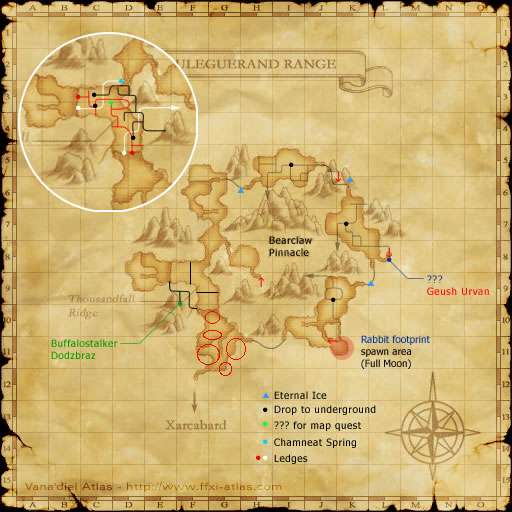 The Snoll in Uleguerand Range are killable at high risk with a high level helper. The risk is Hypothermal Combustion, which can kill a high level helper friend easily. A Beastmaster, or Summoner, can easily and safely kill the level 60-63 Snoll named versions. There are several floating about in the areas indicated on the map above.