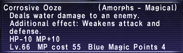 The Slug moves can be dangerous. The Bio from Purulent Ooze is nasty, and Max HP down is never fun. Worse is Fuscous Ooze, which deals Encumberance, a move that removes all of your Armor and Weapons, and prevents them from being equipped again for a short bit. Needless to say, with Blue Magic's Acc based on your weapon's skill level, not having one equipped can cause many spells to miss! Slugs aggro by sound, and will link. The use of any Water Based Magic, or Weapon Skills on a Slug will heal it's HP by the amount of the damage. |