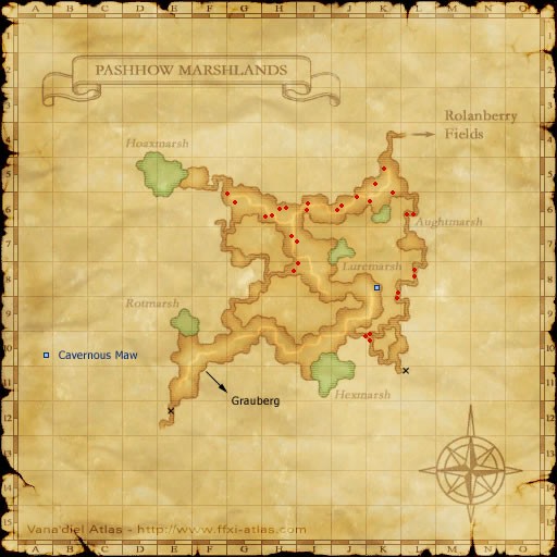 There are about two dozen Lou Carcolh scattered about the Northern and Eastern parts of Pashhow Marshlands [S] as marked on the map above with red dots. They are of higher level then the Slugs in Rolanberry Fields [S], conning DC to a level 75. So they are harder targets. Also there is roving Quadav just about everyplace the Lou Carcolh are in the zone, and it is difficult to find an aggro free place to fight. So based on these two factors, the camp is not recommended, but as always you can learn here if you want!