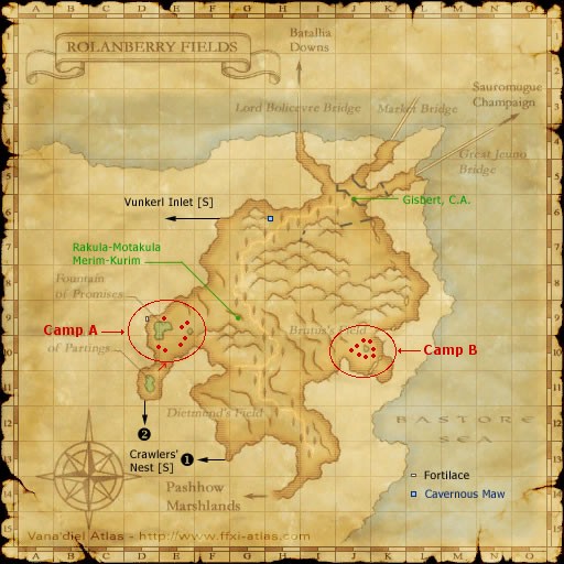 There are two Slug camps in Rolanberry Fields [S], Camp A at D/E-9/10 with seven Scabrous Slugs and Camp B at J-10 with eight of them. The map above shows where they can be found circled in red. Camp A is a great place to hunt the spell. There is no aggro, and it's easy to get to. There are several Goblins near the Slugs in and around Camp B that will aggro, making it a less then perfect place to hunt, so use Camp A. There is sound aggro possible from the occasional Quadav and Gobbue on the way to camp, so take proper care. The Slugs here con as EP to a level 75, so they can be soloed without too much trouble if you are of high level. Care must be taken to stun Fuscous Ooze which can cause a lot of issues with its Pathos like Encumberance move. Using /BST is a great way to farm the spell, as you can pit the Slugs against each other and avoid any worry of the moves. Remember that Slugs link, so take care when you pull, and where you choose to fight. Setting Exuviation to erase the Bio, and other negative moves is a big help, or being /WHM, or bringing a friendly WHM helper along will do the job also. Remember to not use any Water based spells or Weapon Skills on the slugs. Such actions will restore HP equal to the damage you deal to the Slug! Note, at night, a Ghost type monster named 'Evil Spirit' will pop in this Camp. It cons as TW to a level 75, and EP to a level 60. If you are in aggro level, watch for low HP to save yourself some trouble.