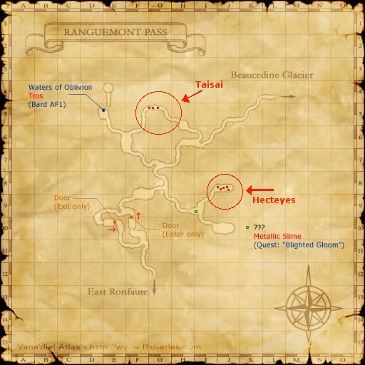 The Ranguemont Pass camp is slightly better because the Hecteyes do not use the Petrogaze or Carthasis move there. This not only makes the fights safer, but since these Hecteyes only have two TP moves, you'll see Death Ray much sooner and more often. There are five spawns there at J-8, marked on the map above with a red circle. The Hecteyes do aggro, but will not link. Goblins are sight aggro, and the bats are sound. Take care on the way to camp. This camp is a bit harder to reach then Camp #2 below, as there is aggro all the way to it, and even in it. If you are not out of aggro level it can be a difficult trip. The three Taisai are farther in at G-5, and you can learn the spell from them also. But as a special NM spawns only of they are left alone and not killed, it's polite to not kill them. So be a good community member and let them be.