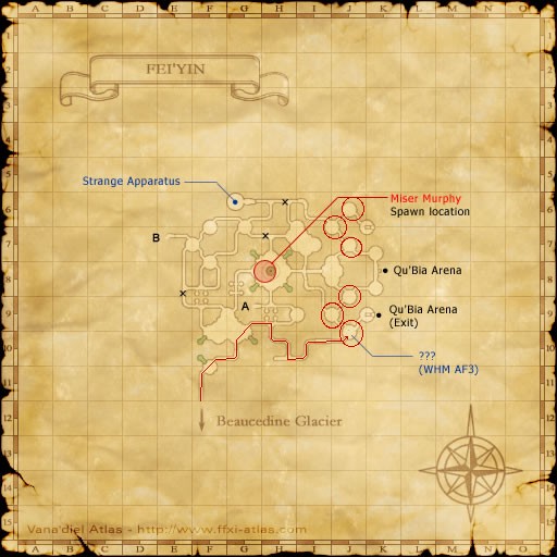 The Best place to hunt Shadow class mobs is in Fei'Yin. Once you Zone in, head to just outside the small round room at J-10. This will be your first camp. In this, and each of the other small round rooms circled in red on the map above, two or three shadows will wander. Carefully pull one out of the room to your safe camp in the hall. The ones with Great Swords will link, so take care with pulling them. They are also BLM class and will cast. Remember to put some distance between your fight and the other shadows in the room, as to avoid low HP aggro, if your fight is difficult. Don't be shy about hitting the Shadows as hard as you can with a real weapon or spells. Shadows hit hard for the level they are, and you don't want to be slugging it out with them too long. Since they only have one TP move, you will always see your spell. You should have no problems killing them.