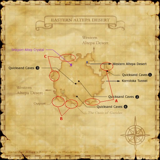 If you do not have CoP access to the Coast you can hunt Giant Birds in the Eastern Altepa Desert. The spawns here are a bit odd. A Bird will spawn in one of the two locations in each of the camps A, B, and C. The Giant Bird will always be in each of the camps in one half or the other. There is sight and sound aggro on the way to, and in a few of these camps. Take care. The fights here are exactly like the ones for Camp #1, use the instructions there for details. Respawns here take a good bit, and with the spawn locations so spread out, it's not the best camp.