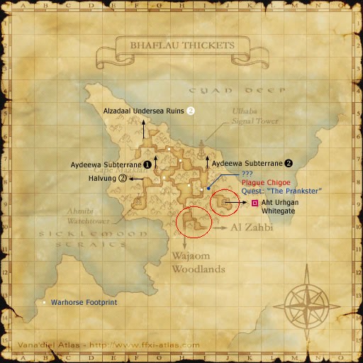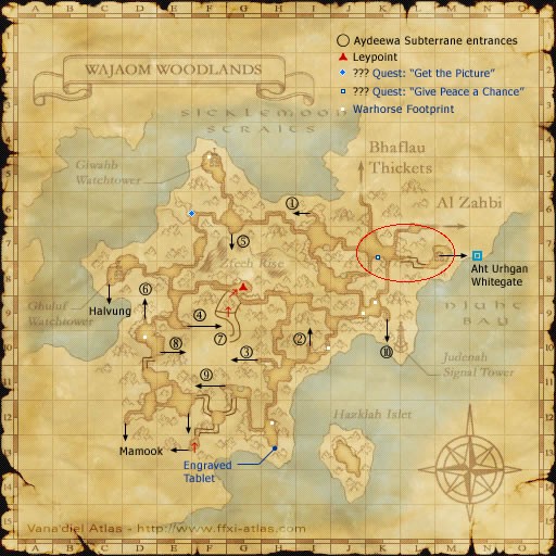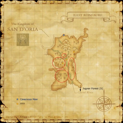 There are close to three dozen Colibri spawns in East Ronfaure [S], mostly in two large clumps in the southern part of the zone. The map above shows the general areas they can be found circled in red. The big win for this camp is that the Colibri are only levels 46 and 47, making for easy solo work. There is aggro possible from the occasional goblin and orc, but it should not be a concern. Colibri neither aggro nor link here. Pull a bird, see the spell, kill the bird, and get your spell!
