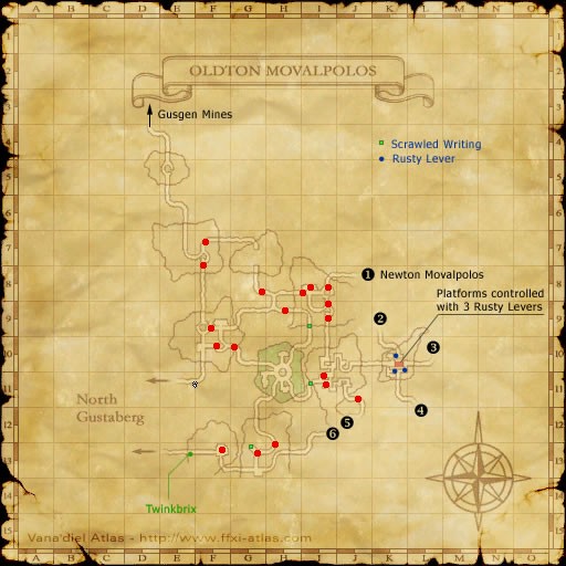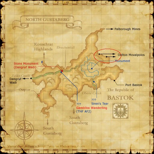 Once in Oldton Movalpolos there are many Bugbear to choose from. They are noted on the map above with red dots. Those closer to the Entrances are the lower Bugbear Servingman, and farther in the tougher Bugbear Bondman. At level 53 you will still get aggro from a few mobs in the deeper parts of the Zone. Take care if you hunt there. It's very easy to get multiple Moblin Links here and get beaten down by an angry Mob of Moblins! Moblins link to Bugbears and Bugbears link to Moblins. The fights are simple. Clear any possible links from near your target Bugbear, or pull it to a safe spot then feed it TP with your low damage weapon and hope for the spell. You should never be in danger. The Higher Bondsmen can put up a stiffer fight, but outside of link issues the fights are safe. Elementals and Bombs can lurk in the zone. Be aware of them before casting magic.