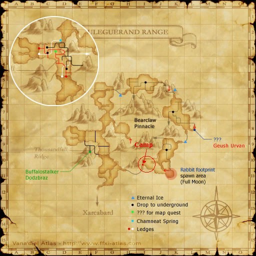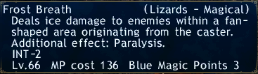 Once you zone into Uleguerand Range, head to the camp at I-10 which is located just after you emerge from a tunnel. You will pass sight aggro Snoll and tigers, and sound aggro Bats on the way to camp. Snoll also aggro magic. Take care. There are several Raptors near camp. They aggro sound. Pull them to your camp, and obtain your spell. The Paralysis from Frost Breath must be removed as soon as possible. It is very strong and can often prevent casting. The Slow from Chomp Rush can seriously disable a Blink Tank, it should be dispelled if possible. A Blue Mage with a Tank operating as a Duo should have no problems with this spell. Simply keep your tank healed and status free, and things will go easily. A Beastmaster can easily solo the spell with local pets.