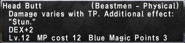 | The Spell deals Blunt damage. Head Butt is perhaps the best spell in the entire game. Every Blue Mage always has it set. You want this as soon as you can use it. | ||||||||||||||||||||||||
