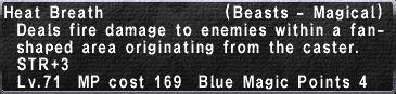 | Heat Breath can be paired with any of the following spells to create the Magic Attack Bonus Trait: Sound Blast, Cursed Sphere, Eyes On Me, Memento Mori, Reactor Cool, Dream Flower or Magic Hammer. | |||||||||||||||||||||||||||