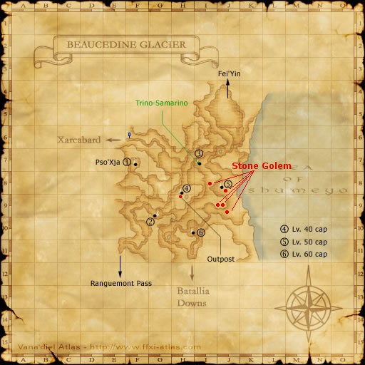 There are five spawns in the zone, all are noted on the map above. Two of the spawn points are close at I-9/J-9 on a small plateau. Respawn on these Golems is not too bad. So waiting for more is not a big issue. Get to camp, and pull a golem to it. Feed TP, See Move, hopefully learn the spell. There is no risk at all for a 90 BLU other then killing the mob too fast.