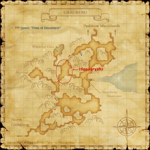 If you do not have CoP access then you can also hunt your spell from Grauberg Hippogryph in Grauberg [S]! Camp is at the G-7/G-8 area as shown on the map above. There are fifteen Grauberg Hippogryph wandering in this area. Like all Hippogryph, they are true sight and will aggro. The Hippogryph here con DC to a 75, so the level range is probably in the 71-74 range. You may need sneak and invisible to reach camp, as some Quadav and Peiste in the Zone can aggro by sound and sight to level 75 players. Due to the level of the monsters, you'll want to be in your 70's when fighting here. A 75 BLU/NIN can solo here with only minor risk. A Tank/BLU Duo, or small party works best. Like all Hippogryph, these are quite soft and not hard to kill. Prepare as described in Camp #1 or #2 and you'll have no issues.
