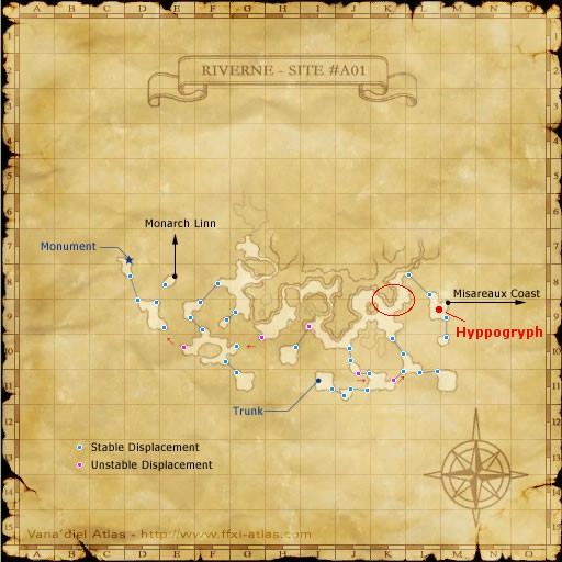 There is one Hippogryph on the very first island right where you enter Riverne Site #A01. Several more Hippogryphs can be found if you move to the larger island to the NW. The re-spawn time is fairly fast here, so itŐs not hard to wait for another try. If you choose to move on to the larger island, be aware that the Wyverns there aggro to sight, while the Clusters aggro sight and magic. The Cloud Hippogryphs are much further in, and as they are higher level, a larger party will be needed if you choose to fight them. Since they take more work to get to, and kill, why bother?