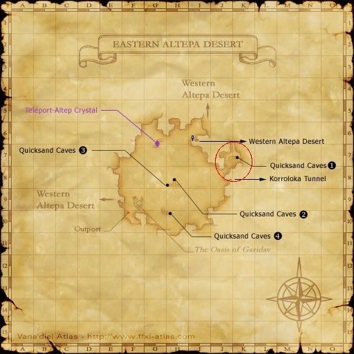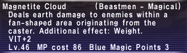 The Best camp for hunting Magnetite Cloud is Eastern Altepa Desert in the J-7/K-7 area. In this area you will find eight Antican Auxiliarius, which are Warrior type Antica. They aggro by sound and will link so take care. There is a huge supply of prey to learn from here, and it's easy to reach with no aggro issues other then the Antica themselves. If you are fighting the Antica while they are still EM or higher, the fights can be a bit dangerous, but if you are careful you can win easily. Buff yourself up, and then pull the Antica to a safe camp with your ranged weapon or Pinecone Bomb. Once the Antica is in range, debuff with your choice of spells between Head Butt and Bludgeon attacks. Watch your MP, and use Wild Carrot as needed to keep your HP up. You'll need to kill the Antica as fast as you can, as you will run out of MP in a long term fight with them. So you'll need to hope to see the spell in the short fight. If you get silenced, use Echo Drops quickly. The poison from Spikeball is annoying, but they miss with the move so often its not a huge worry. If you wait until the level you can use the spell to learn it, which is level 46, then you will simply own these Antica at Camp #1. You can use a low damage weapon to feed TP, and cure any damage easily. If you see Magnetite Cloud you will be able to spam damage spells for a quick kill, and hopefully see that yellow learn message.