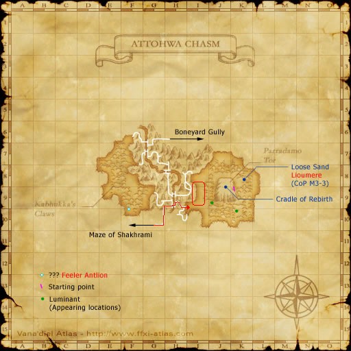 Proceed to Attohwa Chasm and move to camp in the I-9 area. Note that there are sound aggro Hecteyes in the tunnels, and sound aggro Scorpions and sight aggro Goblins in the camp area. Take proper precautions. Once in camp, there are several Tracer Antlions in the area. Pull them to a safe location and work to get your spell. They can hit hard but have weak defense so they are not too hard to take down.