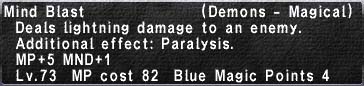 Mind Blast can be learned from the NM Soulflayer that Blue Mages must beat to earn their AF Head piece. A Solid party set up as described in the Camp #1 description, should have no problems beating the monster.