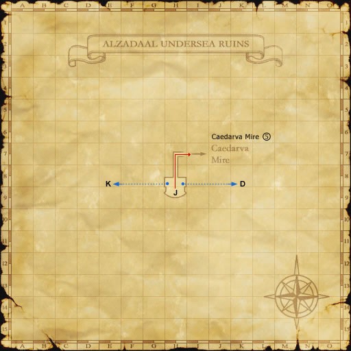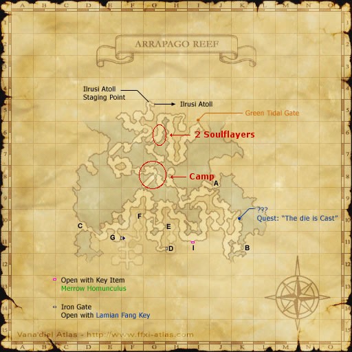 There is a second Mind Blast camp on Arrapago Reef. Your Camp is at G-8, reached by a careful walk (beware the Imps outside the point!) after using the Ilrusi staging point. There are Two Soulflayers at G-6 on the map above. This is a good camp for a BLU/BST, though it can work for a party set up like the Camp #1 build also. If you are trying as a BLU/BST Here is a strategy that has worked. After you reach camp, the hardest part by far is the pull. Your camp at G-8 has 6 leeches. If you are level 73 Convert all the leeches to EM, so you have the strongest pets. If higher, you'll need to work with what is there. You now need to clear some local aggro. Kill off the Qutrub in the middle of the leeches, and then the skeleton on the boat near camp before pulling. You don't want them about if you take some damage while fighting the Soulflayers, and drop into yellow health, as they will blood aggro. The repop timer on them is sixteen minutes, so you will have a lot of time to work with the Soulflayers. But keep the time they will repop in mind so you don't get a rude surprise. Now you are ready to pull. First Charm a Leech, and put up Metalic Body (or Stoneskin if you are /WHM) and Zephyr Mantle or Shadows. Then apply your Silent oil and Prism powder (or cast sneak and Invisible). As noted on the map above, there are two Soulflayers at G-8 to the north of your camp. Head up to them, passing a skeleton at G-7. Get close enough to sic your pet on a Soulflayer and be ready, because it will aggro you as soon as you use sic. Odds are it will open with a magic spell. If it casts anything other then a tier 3 ~aga spell, just stand there and let your pet get hate and let blink and stoneskin absorb the spell the Soulflayer casts. After your pet has hate, use heel and use your silent oil and prism powder quickly and get back to the G-6 camp. Get past the skeleton at G-7 fast, if a Bio or poison is on you, you need to pass it before you fall into yellow to avoid blood aggro. When you get back to camp, sic your leech back onto the Soulflayer, and then swap pets quickly so your leech does not come uncharmed from the pull. Now just keep swapping pets until the Soulflayer dies. A single leech can take 10-20% off the Soulflayer depending on what spells it uses. As long as you don't mischarm on a swap, or get blood aggro on the pull, you should be able to kill the Soulflayers with little trouble. If you bring another BST, or a team of them, they can demolish the Flayers at this camp.