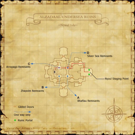 If you have access to the Nyzul Island Staging Point skip ahead three maps. If you do not have the Staging Point, grab a Chocobo and ride, or walk with sneak and invisible to F-6 in the Bhaflau Thickets. Give the Immortal there a Imperial Silver Coin to enter The Undersea Ruins.