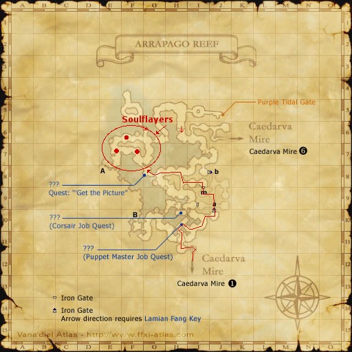 Mind Blast can be learned on Arrapago Reef. There are Three Soulflayers noted by red dots on the map above. You will need to have the Lamian Fang Key to reach the camp. There is sight and sound aggro on the way to the camp. Take precautions. The Soulflayers here are just as tough as the ones in Camp #1 above. Use the same methods to kill them. ~~~ Another option here is possible if you can find two 75 Beastmasters to help you out. There are Crabs in this area, that a pair of Beasmasters can use to duo the Soulflayers. Each Beastmaster should charm a Crab, sic the Crab onto on of the Soulflayers and then stay far away. Make sure to not let the Crabs die, as repop takes a bit. The pair of crabs will wear the Soulflayer down. One pet swap may be needed. DO NOT mele with the flayers. There are enough Crabs in the area to get the job done, even with a swap or two.