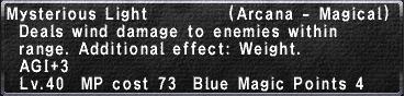 | Mysterious Light can be paired with any one of the following spells to create the Max MP Boost Trait: Metallic Body, Magic Barrier, or Hecatomb Wave. | ||||||||||||||||||||||||||||||||||||||||||||||||||||||||||||