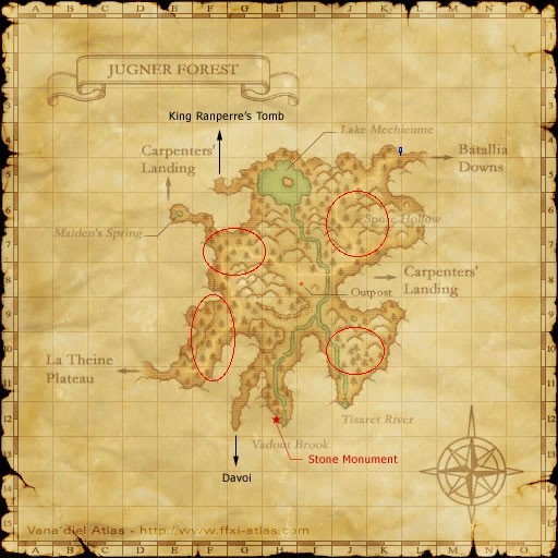 There are four Walking Tree spawn points in Jugner Forest. The Trees will spawn in the general areas indicated with red circles on the map above. At level 30 you should have no problems soloing the trees. Be aware there are Tigers, Orcs, and Goblins that can aggro in the area. Take precautions. Also, Sapling type monsters will link with a Treant if you are fighting one. If you are lower level, picking up a few adds can be a problem, so take care!