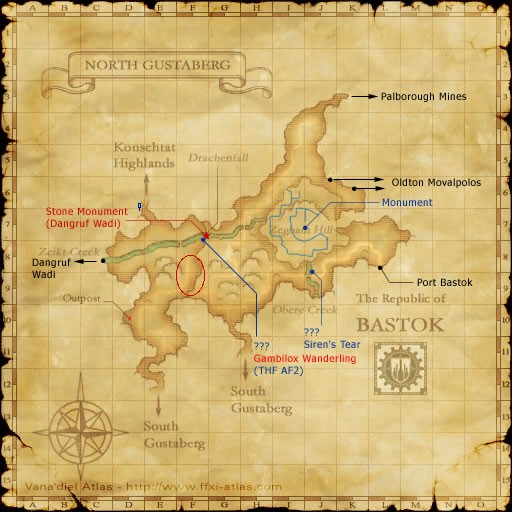 If you wish to solo the spell, then you best bet is in North or South Gustaberg between the night time hours of 20:00 and 04:00. Black Wolfs will spawn in both the North and South Gustaberg, most often on the Hills with ramps that you can climb. There is always one spawn at the F-8/F-9 area. This Spawn area is noted on the Map above. Even if you are learning the spell at level 12, as soon as you can, these wolves will be very weak, and die easily if you hit them at all. So, to learn, take off all your weapons and armor, and attack the wolf, hitting it Hand to Hand only once, then turn your back on it. Let it hit you to build TP. It will take about sixteen hits for it to have enough TP to do a move. Yes it's mind blastingly boring! Given that Hounds don't seem to favor Poison Breath, it can take a long time to see the spell. Your fights will last as long as you have MP to cure yourself. If you set auto-regen with Sheep Song and Healing Breeze, you can last a very long time. Eventually the Hound WILL use the spell. Turn and kill it. Hopefully you will learn. If not, try to find another, or wait until the next night at the camp above.