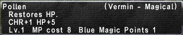 | Many Blue Mages recommend getting Pollen as your first spell. This is for two reasons; One, once you obtain it, you can use the spell to keep your HP up as you hunt other spells. Second, you can spam the spell upon yourself to raise your Blue magic skill level, and reach the cap for your level. Capped Blue magic skill allows for better learning. | |||||||||||||||||||||||||||||||||