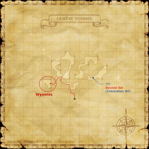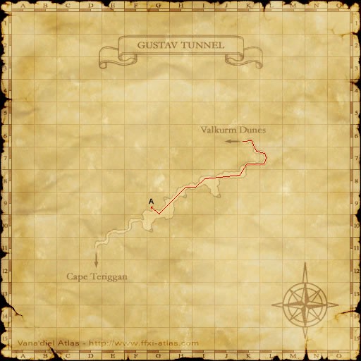 Enter Gustav Tunnel from the Secret Beach at the Dunes. Proceed to the zone marked A on the above map. You will need sneak for Bats, and invisible for Goblins.
