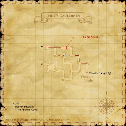 Enter Ifrit's Cauldron from the Eastern most entrance in Yhoator Jungle. Proceed to the zone marked A on the above map. You will need sneak for Bats, and invisible for Bombs. There is a flame spout on the way, it is guarded by a bomb. Bring an ice cluster to trade to it to put it out, or be ready to wait for it to drop on it's own.