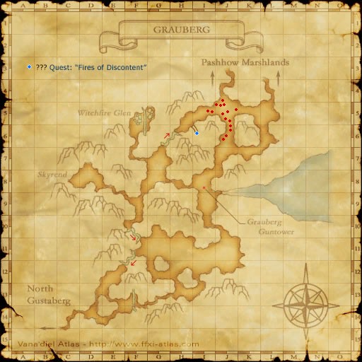 There are around fifteen Peiste spawns in the north most part of Grauberg [S] near the zone to Pashhow Marshlands [S] at J-5/6. The map above shows them marked with red dots. There is aggro possible from the occasional Goblin and Quadav near camp, but it should not be a concern. Peiste will aggro by sight, but do not link. This is the best camp due to the level of the Peiste, lack of aggro, and a nice camp location. The best camp is right in the little canyon leading up to the Pashhow Marshlands [S] zoneline at J-4, here you can pull your target to and fight with no worry of other aggro. The Peiste here con as EP to DC to a level 75, so the level range is high 60's to low 70's. If you plan to try and solo, take that into account. For your fights you need to be very careful of the Paralyze and Petrifaction moves. Both can turn a solo fight against one easily. Have a Remedy or /WHM for Topefying Charge, and fighting with your back to the Mob, and using low MP cost spells to feed TP, protects you from the Petrifaction move. A small party can make this spell a lot simpler to farm. A White Mage is a huge help for Stona. A High 60's BLU with a WHM support for status effects and cures should have no issues with the mobs here.