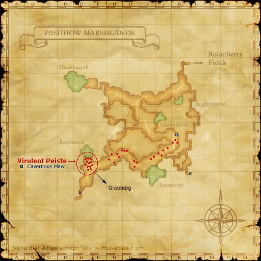 Peiste, and Virulent Peiste, can both be found in the southern part of Pashhow Marshlands [S]. The twenty or so normal Peiste are marked with red dots, and the twelve Virulent Peiste, located at E-10 are circled. As all the targets here are of higher level then the Peiste in Grauberg [S], (with the Virulent Peiste VT to a level 75) and there is a lot of other aggro from Quadav and Goblins where they spawn. So this camp is not recommended for the easiest or safest spell farming.