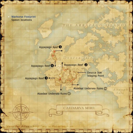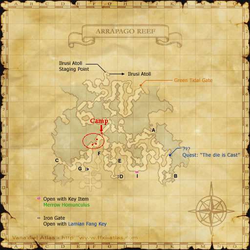 Once you zone into Arrapago Reef, head to the camp near the exit of a cave towards the west side of G-9. The walk is dangerous, and you will face, sight, sound, Low-HP, and true-sight aggro on the way, so take proper care. There are several imps in the caves in the H-9 area, which is the most difficult part of the trip. Once past the imps, you will be at camp, a hill rising to the caves exit, this is a safe place to pull Qutrub to with no aggro worries. Your targets are in the open area, noted with a red circle, to the west. There are several Quatrub in easy range. The Qutrub will aggro via sight and sound, and can link, so be careful. Pull them to your camp, and proceed to try and break the main hand sword. Take care to not break the second weapon. The Qutrub here have two job types, BLM and DRK. Silencing both is very helpful. Respawn is fast enough that you should never want for a target. Warning! A death in this camp can cause the NM Lamia #19 to spawn on the dead party member. Needless to say, this will end anything less then a very full, and skilled party.