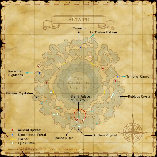 Once you zone into Al'Taieu, head to the ramp at H-11 that leads up to the Grand Palace of Hu'Xzoi. This ramp makes for a very safe camp. From here you can pull lurking Ul'phuabo. Om'phuabo are found roughly from 7 O'clock clockwise around to 5 O'clock on the map of Al'Taieu. As they are higher levels and very nasty fights, they are not recommended with the lower ones so easily reached.