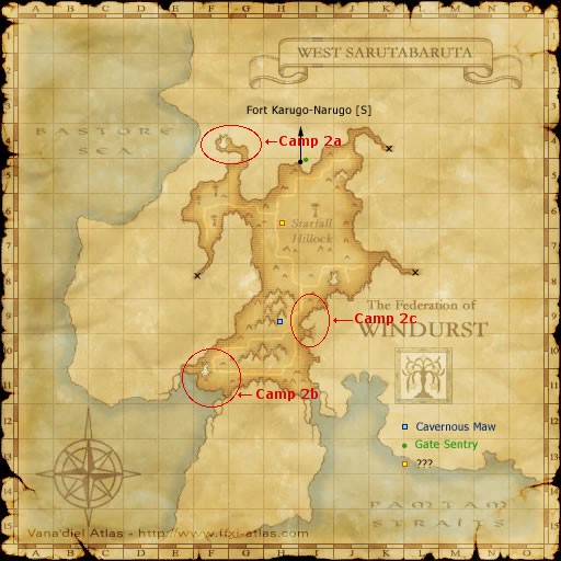 A camp for Water Bomb exists in West Sarutabaruta [S]. At the locations F-4, F-11, and I-9 there are Toads. They look like normal frogs, and have no hats and staves like Poroggo's. When the weather is foggy in West Sarutabaruta [S], which can happen between 0:00 and 9:00 game time, Two Poroggo Gents will spawn at each of the camps. No Toads need to be killed to make them pop. They will pop in addition to the Toads that are there as soon as fog happens. The Toads are level 50-52, and have no special TP moves. BUT they do attack very fast, and they link from a very large range. So it is very easy to end up with a large number of them on you if you are not careful. Once you get more then two or three hitting you, interruptions to spells can become a real issue. They can kill even high level players with sheer numbers. Toads will link to the Gents. So be careful. Like all Poroggo, the Gents love to cast nasty magic, and have the full range of TP moves, including Frog Song, and can fast cast Death and other unfun special spells. Deal with them as noted in Camp 1 above. The only difference being, that since these Poroggo are much lower level, they are very soft, and hard to feed TP to. If you get charmed while solo, a despawn can happen.