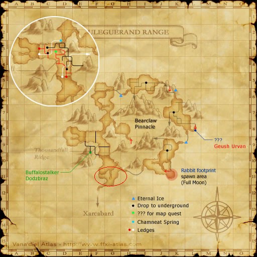 There are higher level Rabbits to be found as you enter, as noted above with a red circle, or move around Uleguerand Range in a counter-clockwise direction toward it's top. As they are higher level, they will be more difficult to kill, and require help or a party. A 65+ Blue Mage can easily solo the lower Rabbits here. Be ready for the Paralysis move, and Wild Carrot can cure for a huge amount with these monsters. Because of the excellent lower level camp #1, these are not recommended.