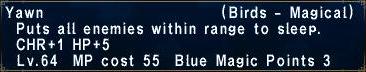 Apkallu have a communal hate based on how many you have killed, much like Tonberries and Fomors. As your Apkallu hate goes up, they start using more and different TP attacks, initially they only use Yawn. They start to react strongly to White Magic, and become very difficult to kill as physical attack damage drops to nothing. So killing a lot of them will make life much more difficult. Odds are you will only encounter Yawn as a TP move. So the TP moves are not a worry. |