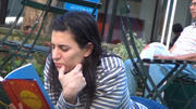 So I see her and I nearly have a heart attack, but after the moment of amazement, I think, ok now I have to capture some footage. The fates were smiling on me today and I was able to sit on a stone step that was at the edge of this elevated seating area and get my camera out. For a good ten minutes she sat there, oblivious to me, flexing her feet as she drew (I stick my tongue out when I concentrate on a sketch -- I think she flexes her toes). After a while she came up from her concentration and noticed me. At that point, as always, I wondered what she would do, but I wasn't too worried because I already had ten minutes of footage. But she looked at me with a kind of gentle bemusement, not anger at all. She flexed her feet a bit, and went back to her work. I was so relieved!