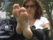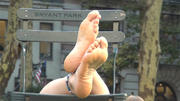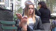 I shot her for about another fifteen minutes after she noticed, and that's where the footage from this clip comes from. She moved around a bit but always kept her feet up for me, sometimes giving me a curious look and with a little smile she was trying to keep to herself. What's interesting about this segment is, just as I was drawn to her dazzling beauty and straight-out gorgeous feet, many others were too. It must be weird to be this beautiful, because people treat you like public property. Three times guys came over and talked to her, and she was polite but basically brushed them all off. The funniest was the third guy, and older Latino dude who actually came into the lens for a while when he was checking out her toes. (I edited him out.) Then he came over and stood basically right over me, and I assume he saw the camera because it was right there in my lap. He said something to her in Spanish, loud enough that she could hear him, and she says, curtly but with a little smile (see the fifth vidcap), thank you, then she says something else in Spanish. At that point he left.