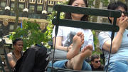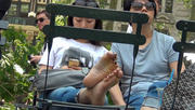 This was a petite woman, about five feet tall, immaculately dressed and appointed, with an expensive bag and a beautiful, tasteful manicure and pedicure. She was an outstanding beauty, reminding me of Madeleine Stowe. And there she was, sitting in the sun, her tan moccasins off, her flawless bare feet up, her high arched soles pointed out! Only one issue was that she had the seat back pointed out opposite her face, which obscures the woman a bit, but you can't have everything. That was the only thing even slightly off about this -- she saw me sit down and she can be seen glancing casually at the camera lens in the beginning of the segment, but then she puts her shades back on and goes back to her texting.